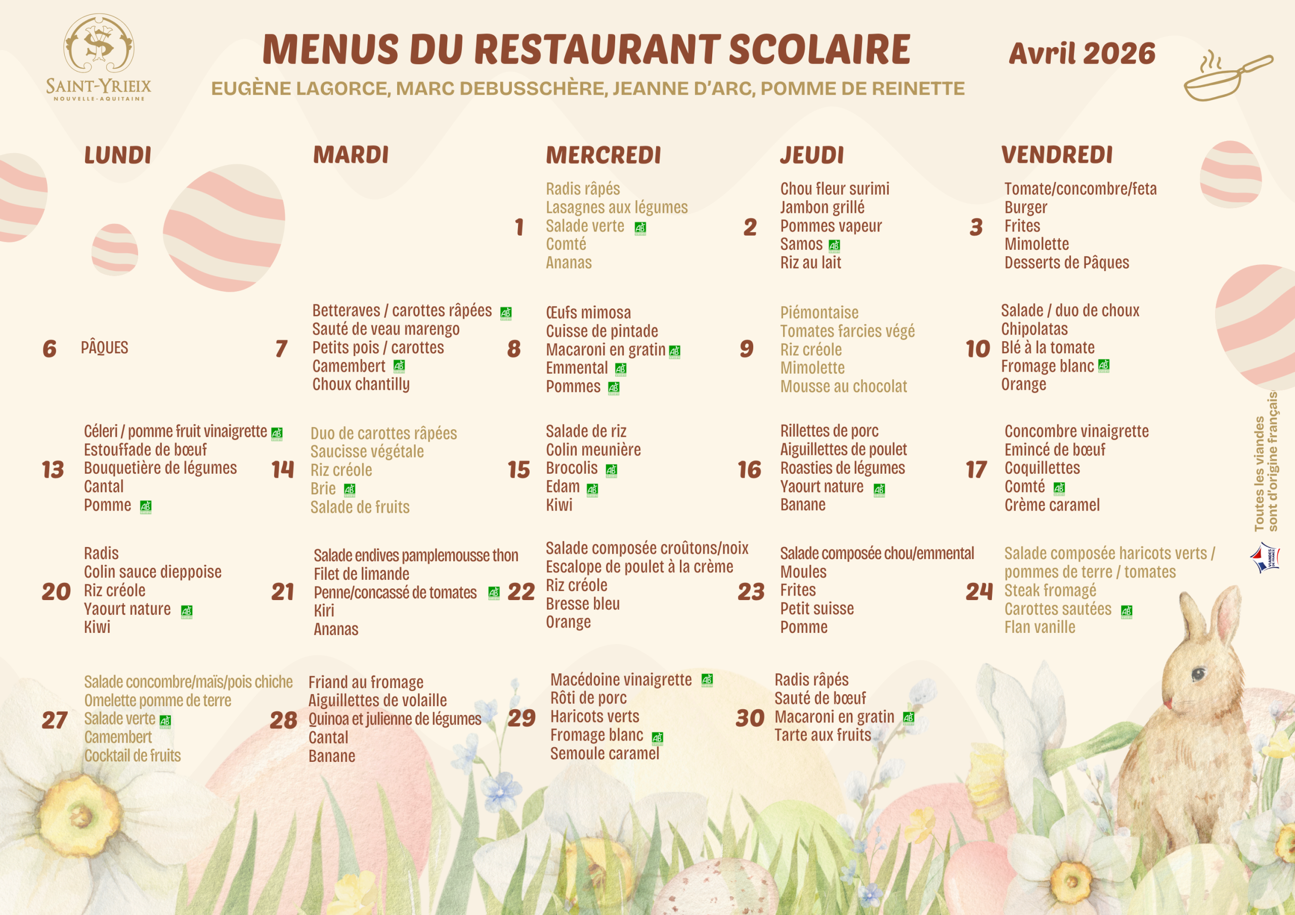Les menus sont établis par l’équipe du restaurant scolaire et corrigés par une diététicienne.